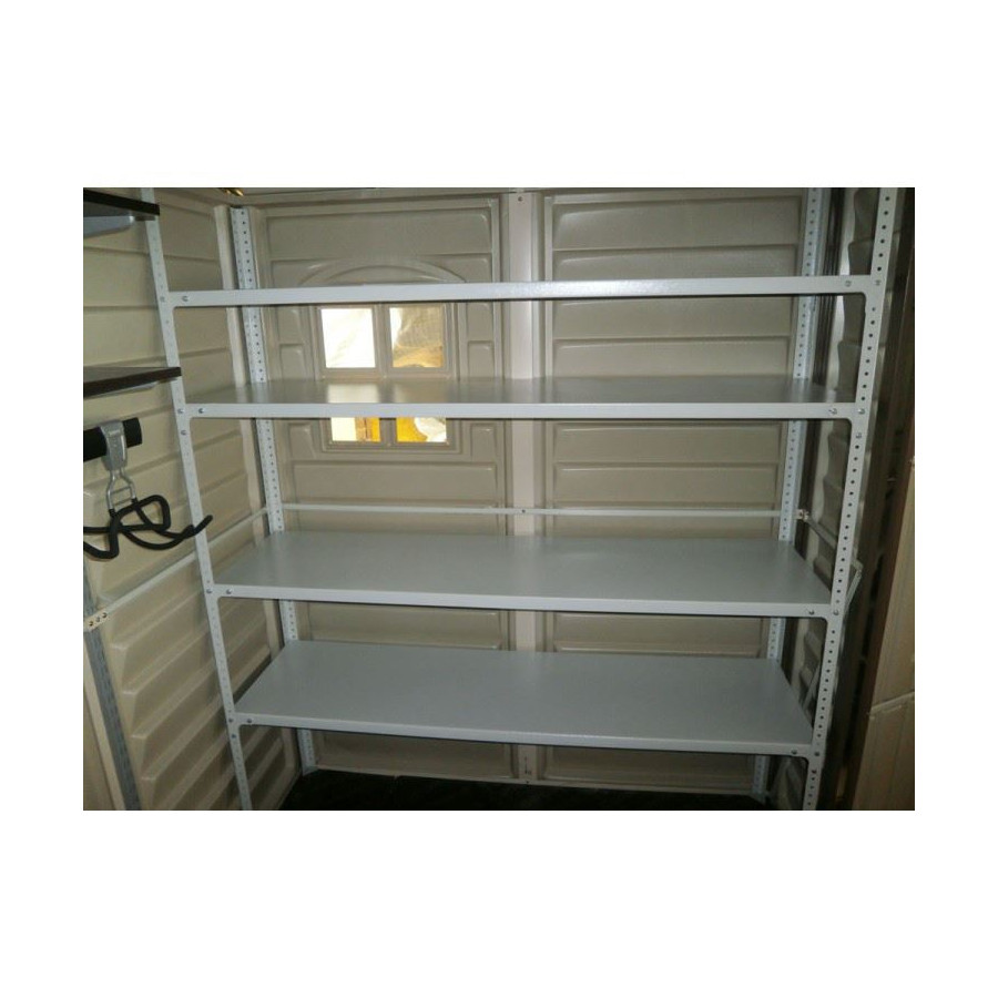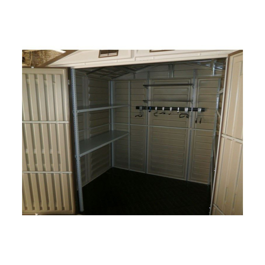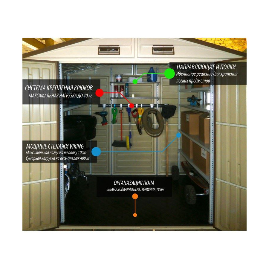 Прочный и вместительный пластиковый сарай - идеальная замена большой кладовой комнаты. 13,5 куб.м свободного пространства позволит Вам надежно хранить уборочную технику, вещи и мототехнику прямо рядом с домом. Хранилище выполнено из прочного винила с армированным металлическим каркасом. Такая конструкция позволяет переоборудовать пластиковый хозблок по вашему вкусу - повесить полки, разместить инструменты. Также он может использоваться в качестве детского игрового дома или малой мастерской.