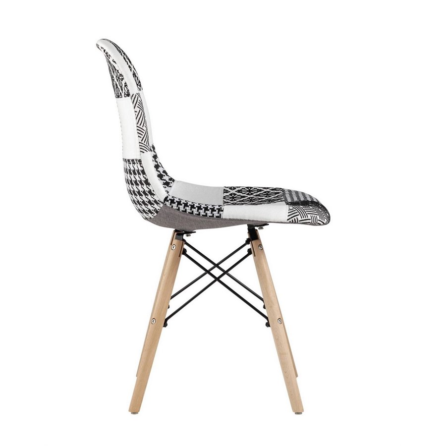 Стул кухонный из серии DSW в обивке из ткани, выполненной в технике пэчворк. Эргономичная спинка обеспечивает оптимальный комфорт.