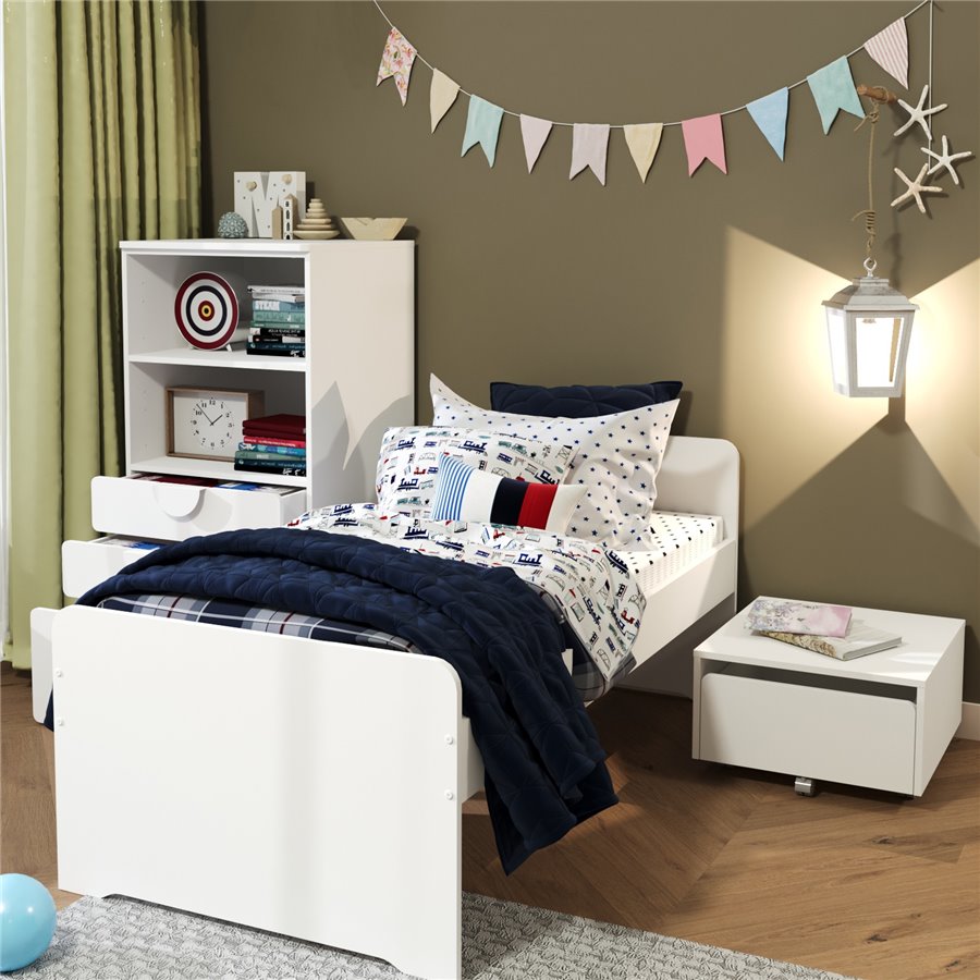 Комплект включает в себя кровать, стеллаж с выдвижными ящиками и тумбу.